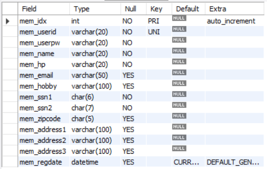 insert into tb_member (mem_userid, mem_userpw, mem_name, mem_hp, mem_email, mem_hobby, mem_ssn1, mem_ssn2,