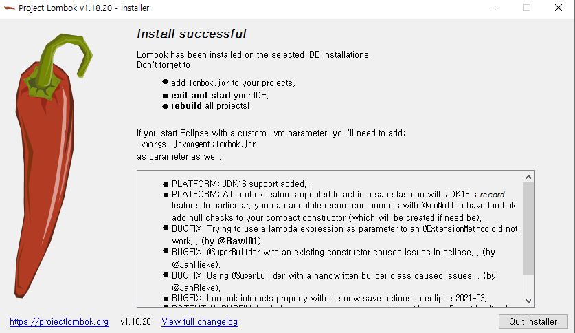 - 이클립스와 스프링 플러그인 만으로도 스프링 개발이 가능하지만, Lombok(롬복)을 이용하면 Java 개발시 getter/setter, toString( ), 생성자 등을 자동으로 생성해주므로 설치하여 사용하는 것이 좋다.