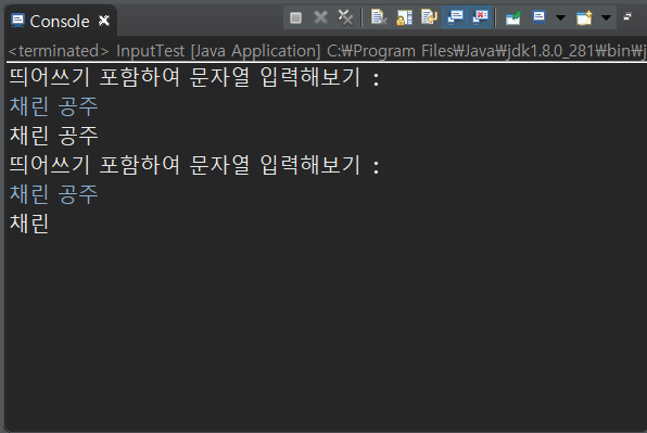 nextLine() : 통째로가 사용자가 입력한 문자열 값(엔터치기 전 공백까지 포함한다.)