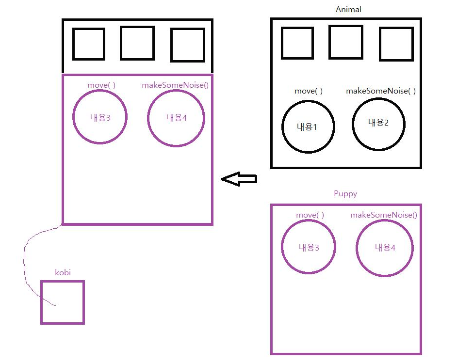 기존에 만들어진 부모필드의 a( ) 메소드에 자식에서 작성한 메소드 내용이 덮어 씌워진다.