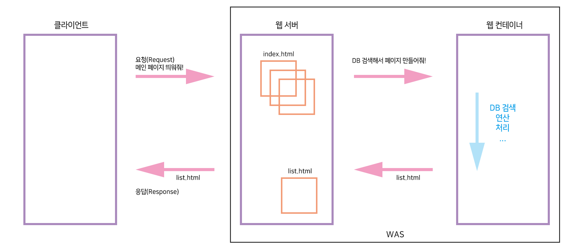 - 이후 연산이 끝나면 정제된 데이터(JSP, 서블릿)로 서버에 돌려줌