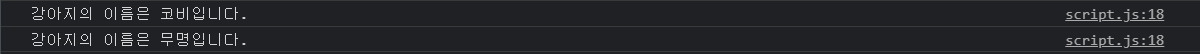 console.log(`강아지의 이름은 ${name}입니다.`);