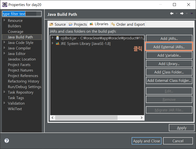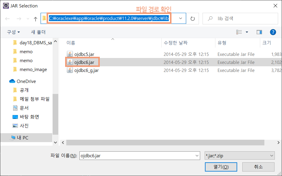 ojdbc6.jar 파일 선택 후 추가