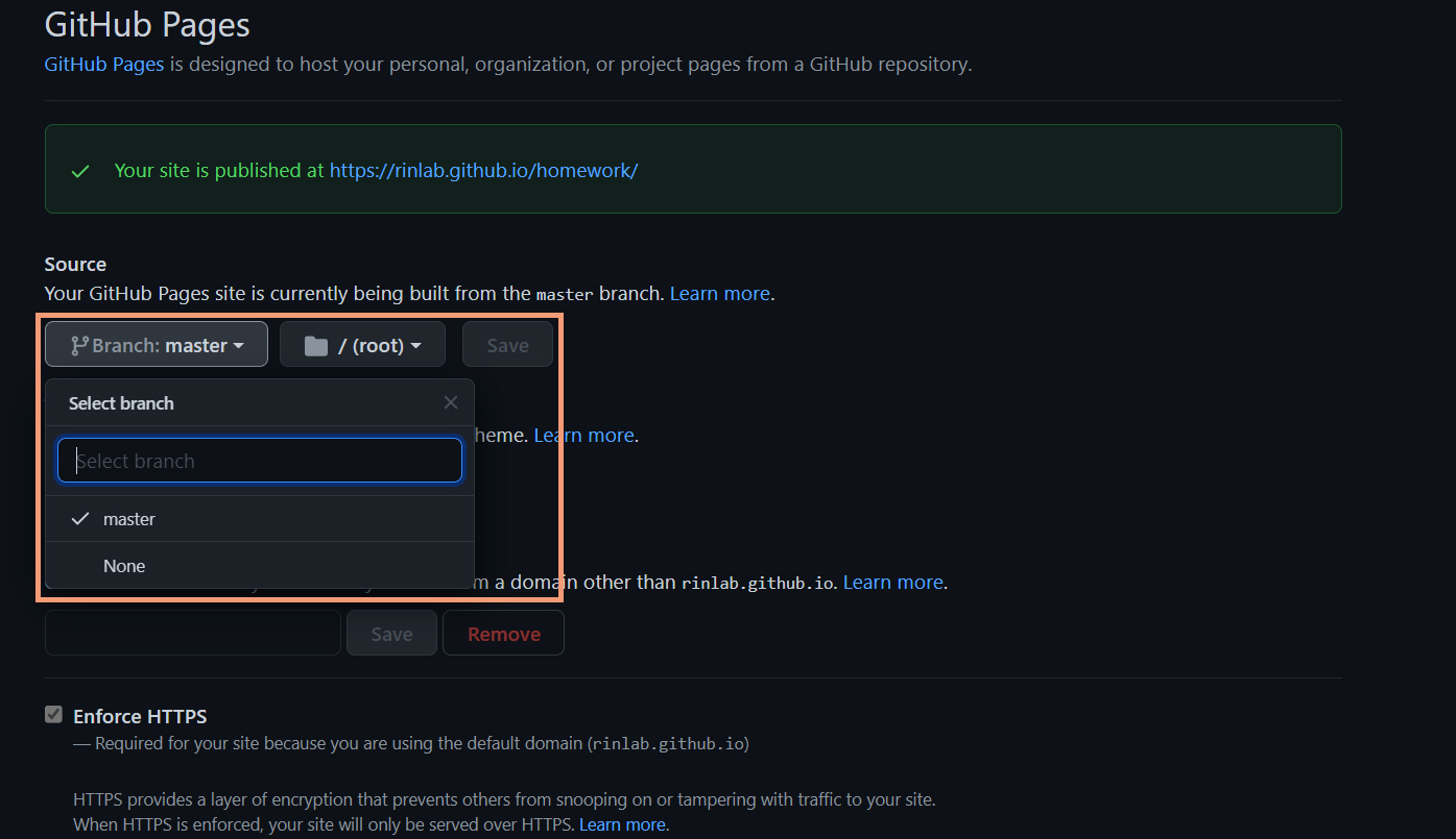 3. Source 목록의 Branch를 master로 설정 후 저장하면 상단에 GitHub Pages 링크가 생성된다.