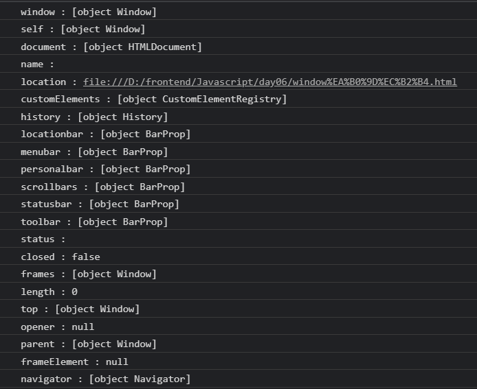 3) window 객체의 프로퍼티 출력해보기