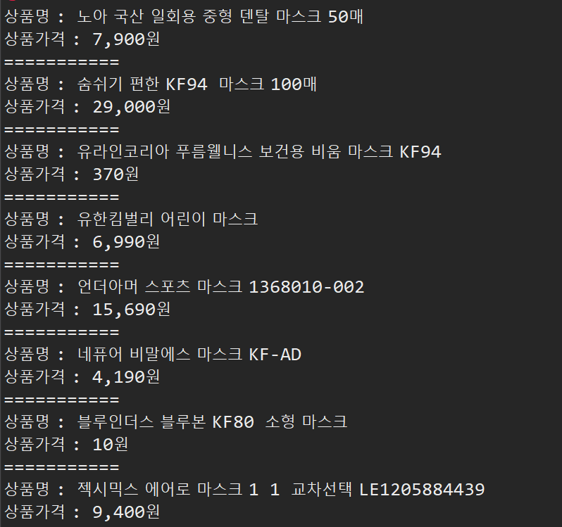4) 웹 크롤링 (Selenium)사용예제 - 네이버에 접속하여 "마스크"단어 검색하여 상품명, 가격 가져오기